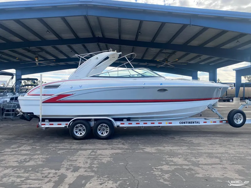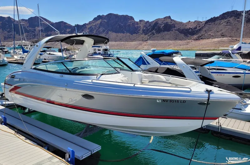 The unique bow seating area features legroom and flip down armrests for the forward-facing seats. This big-boat design theme is sprinkled throughout the 290 BR, which features the driver's dash layout. As is traditional with Formula, the windshield frame of the 290 is stainless steel for added strength and durability against the elements. Seating in the 290 is luxurious and comfortable throughout. Clearly, Formula focuses on passenger comfort. The helm seat is extra wide, affording enough space for a co-captain at the helm. See it from afar and your eye can't help but notice the gleaming hull sides, the result of Formula opting for Imron paint for colors and graphics. Step closer and note that the deck and cockpit liner are part of one continuous mold as is the head compartment, the latter finished off with a genuine Corian countertop and porcelain head. The attention to the smallest details extends to seat cushions that are designed to stay in the open position without gas shocks when accessing stowage, double needle stitching and Torx fasteners on the dash, linked latches on the walk-through windshield, and Formula's infamous "clocking" of screws in the rub rail. "It's a FORMULA" Stop by the Lake Mead Marina Sales Dock today!**TRAILER INCLUDED**