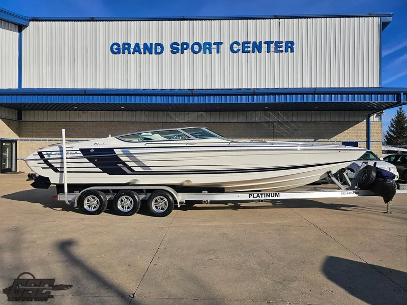 Clean custom paint! Stainless rubrail, deck rails, low profile windshield design. Rear swim step with drop down swim ladder.