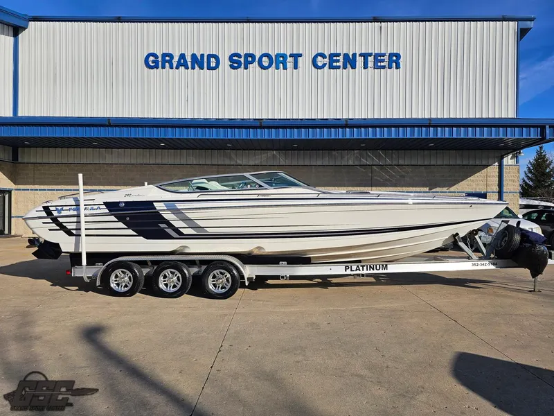 Twin Mercruiser 6.2L 350HP engines, fuel injected V8 power. Bravo drives with hydraulic steering, 28P stainless 4-blade props, dual ram trim tabs.