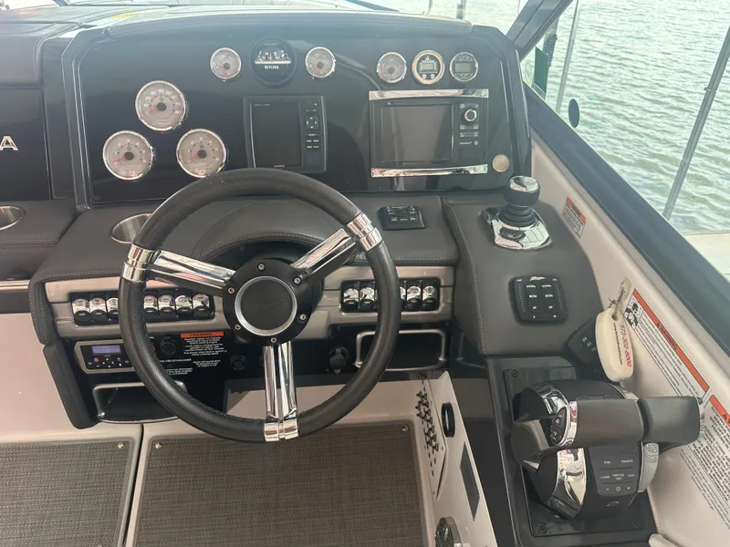 • Molded fiberglass dash in Charcoal or Mocha w/Liquid Black panels, Ritchie® compass, Garmin® 547 GPS color chartplotter, digital depth sounder, illuminated waterproof accessory rocker switches w/E-T-A® circuit breakers, Livorsi® illuminated instrumentation, domed w/chrome bezels, auxiliary 12V outlet & tilt wheel in leather wrapped stainless