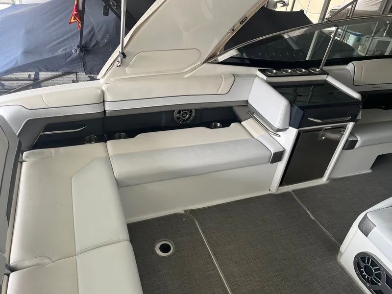 A custom, locally installed Waves N Wheels premium stereo system upgrade provides outstanding sound throughout the boat, making it perfect for entertaining friends and family out on the water. The 330 CBR offers a spacious bow seating area, comfortable cockpit lounge seating, and a well-designed helm with excellent visibility and controls.