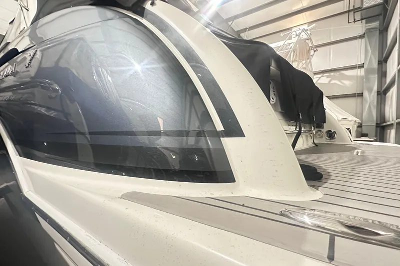 - Continuous tinted, tempered curved-glass windshield w/stainless steel top frame & center walk-thru