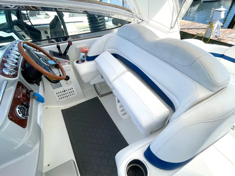 Continuous molded fiberglass deck & cockpit liner • Molded fiberglass in-dash deck access steps w/316L stainless handrail • Burl wood-finish dash panels • Complete Gaffrig™ illuminated instrumentation, domed w/chrome bezels • Ritchie® compass • Raymarine Tridata depth/speed/water temperature display • Gaffrig shifters/throttles • Dino™ tilt steering wheel w/burl insets • Fingertip boat leveler switches • Illuminated waterproof accessory rocker switches w/E-T-A® circuit breakers • Auxiliary 12V outlet • Stereo volume control • Two 300W 6"x9" 3-way marine-grade speakers & two arch-mounted 100W 6 1/2" 2-way marine-grade speakers • Fifteen drink holders • Courtesy lighting • Integral 316L stainless safety rails • Weather-resistant cockpit seating featuring Dri-Fast® foam & StarLite® XL synthetic marine panel construction • Twin command seating w/dual-position helm & passenger seats • Port lounge w/fiberglass-lined storage • U-shaped lounge seating w/fiberglass-lined storage • Aft sun lounge package w/two dual-height cockpit tables & filler cushions • Molded fiberglass wetbar w/Corian® countertop, trash receptacle & 120V GFCI outlet • Fire extinguisher • Disconnect switch for auxiliary 12V power • Berber cockpit carpet • Pneumatic-assist transom door • Bimini top, front & side curtains w/easy-mount zipper connectors & extended aft cockpit enclosure in color-matched non-fading Sunbrella® solution-dyed acrylic fabric with water-repellent SeaMark™ vinyl undercoating, or white polyester fabric w/double-coated resin topside & water-resistant underside coating • Cockpit cover in color-matched non-fading Sunbrella® solution-dyed acrylic fabric with water-repellent SeaMark™ vinyl undercoating, or white polyester fabric w/double-coated resin topside & water-resistant underside coating