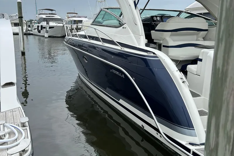 Why limit the expectations of your cruising lifestyle? The Formula 40 PC delivers everything you want - beauty, function and performance in one breathtaking package. The 40 PC cockpit is smartly executed. A double, adjustable helm and portside lounge encourage socializing underway, and the U-shaped lounge and fully-appointed wetbar aft make entertaining a breeze. Below, handcrafted Corian® countertops and high-gloss wood-grain cabinetry enhance the richly-accented cabin. Ultraleather™ lounges beckon you to relax and enjoy state-of-the-art audio and flatscreen video systems. The sleek, classic Formula profile is a canvas for your choice of gleaming graphic packages, and the optional cockpit hardtop adds an exciting touch. The proven deep-V hull ensures a smooth ride and solid tracking.
