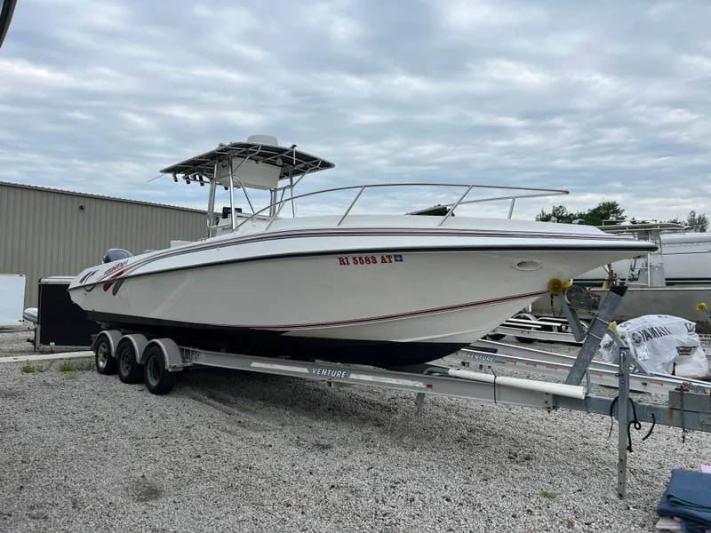 Developed with the serious angler in mind, the 31 Tournament Edition is the ultimate fishing rig in its class. This boat initiated Fountain's domination of bluewater fishing tournaments. Equipped with a pair of 200 Yamahas, this boat runs over 50 mph -fully loaded. Coupled with a notched transom and pad keel hull design, the 31 Tournament Edition is extremely stable, steady at trolling speeds and well-equipped for the tough trips. Other features include: Seven stringers and 10 bulkheads which are glassed into place for superior structural integrity Heavy-duty trim tabs and hydraulic steering Complete instrumentation A 400-quart insulated fish box with overboard drains a 50-gallon circulating livewell, rod holders and a self-bailing cockpit liner Fountain uses high density foam, Interplastic vinyl ester resins, multi-directional fiberglass and laminates its hulls and decks together creating a unitized process that is race course proven. A proven workhorse the 31 Tournament Edition will undoubtedly get the job done! Beam: 8 ft. 4 in. Fuel tank capacity: 204 Features: T-Top ICom VHF Fusion Stereo Simrad GPS Lowrance HDS (Fish Finder) Trim Tabs Anchor locker, recessed in forward bulkhead Bilge pumps (2), automatic 1200 GPH Forward Cabin Hand laid composite hull and deck manufactured w/multi-directional fiberglass, w/high density coring and Interplastic vinyl ester resin and w/hull and deck laminated, thru-bolted, screwed and sealed together w/heavy duty marine sealant/adhesive Helm station, full instrumentation, molded foot rest, port and starboard side panel, tackle storage Hydraulic steering Propellers, stainless steel Rod holders Transom storage boxes, insulated Battery switches (2), parallel Center console w/electronics locker, one piece, molded foot rest, dry storage inside and forward facing seat w/400 quart fish box Cuddy cabin w/V-berth, rod storage, fluorescent lighting, porta potti Livewell, 50 gallon at transom Rod storage under gunwale T-Top, heavy duty w/ electronics box, canvas, rod holders Trim indicators, electrical for motors and mechanical for tabs