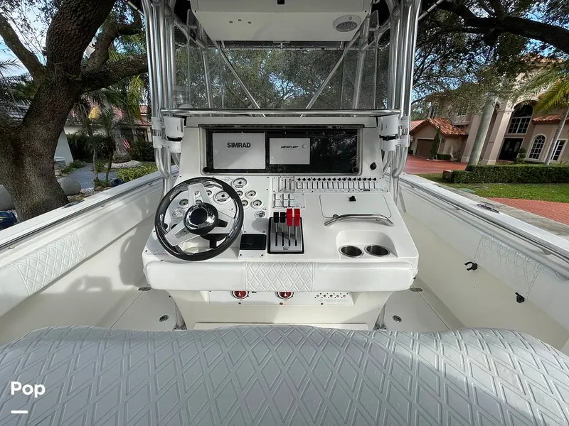 The 32-foot vessel has a sleek, aerodynamic design that is both stylish and functional. The center console design of the boat provides a wide-open deck layout with ample room for fishing and other activities. The helm is equipped with a full complement of gauges and controls, including a Simrad GPS, VesselView and a JL audio system.