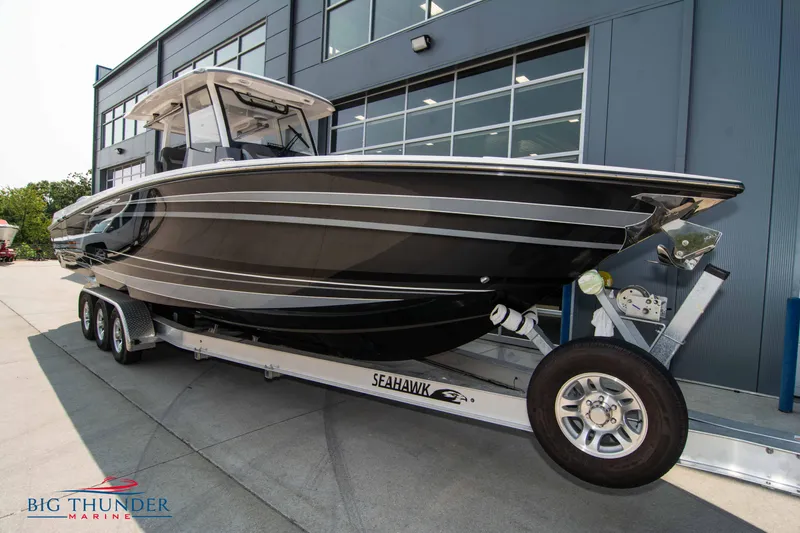 2022 Fountain 32NX, 2022 Fountain 32 NX Triple Custom paint matched Mercury 300R Verado's w/ DTS controls. 280 K-Planes. Bow thruster. Engine flushing system. Custom paint & graphics. Premium NX Sport upholstery upgrade. Lumitec Sea Blaze 2 RGB underwater lights. Bow seating w/ upholstered seat backs & bottom w/ storage. Folding transom bench seat. Cockpit side dive door w/ ladder. Electric SureShade. Screened portlight. Triple Garmin 8612 multi-function displays. Airmar B60 transducer. Premium JL Audio w/ Fusion RA770 touch screen entertainment center w/ built in WiFi, (6) 7.7 Spkrs. w/ custom painted grills, (2) 10" subs w/ custom painted grills, (1) 1500W 6 Ch amp & (1) 2250W mono block amp. XM Radio ready option. Wireless phone charging pad. Stainless steel steering wheel w/ "speed knob". Windshield wiper. Enclosed head w/ marine toilet, overboard discharge, fresh water glush & holding tank, fresh water sink. Fresh & raw water wash downs. Transom shower. Anchor windlass w/ thru hull striker plate, polished stainless steel plow, 15' of 5/16" galvanized chain & 150' of 5/8" 8-strand braided rope. Battery charging system. Trailer not included, new trailer quotes available separate. Financing and nationwide delivery also available, all 2010 and newer model year trades considered. Call for more info and demo scheduling.