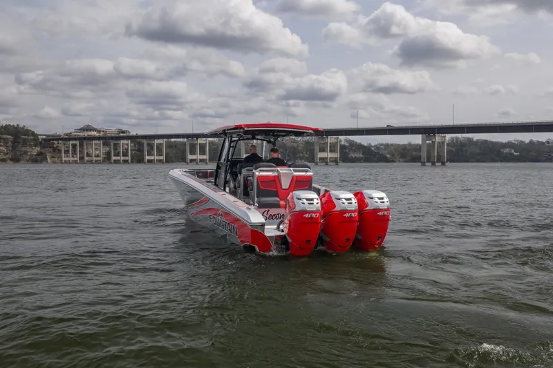 2021 Fountain 38 SC, Triple Mercury 400M with joy stick Verado's (60 fresh water one owner hours - motors are non-Mercury Racing wrong decals were applied after painted - 75 mph), Paradise graphic full paint including motors, console, dash, deck ring and hard top lip, dive door with ladder, double row stand up bolster seats, extra 20 gallon fresh water tank, sureshade, usb outlet in dash, windless, XR radio ready.