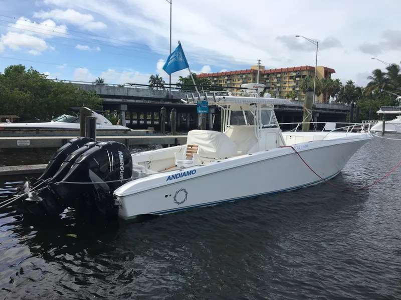 You're looking at a 2007 Fountain 38 TE powered by triple Mercury 300 hp verados with less than 530 hours. The boat is equipped with dual Raymarine GPS, Raymarine radar, autopilot, VHF, depth sounder, kenwood stereo, bow thruster, remote spotlight, windlass anchor, powercoated T-top, powercoated bow rail, flip down bolster helm seat, raw and fresh water wash downs, one main tank with aux tank, forward cabin , bow cushions, triple battery switches, dive ladder, fighting chair and more. FINANCING AVAILABLE and WE ACCEPT ALL TRADES.