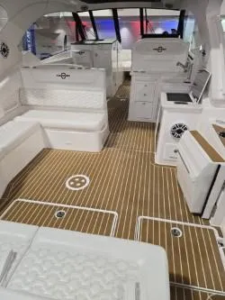Step aboard, and you'll be welcomed into a world of unparalleled comfort and elegance. The salon area invites you to relax and unwind in the plush lounge seat, accompanied by a removable table for delightful conversations and a touch of sophistication. In the aft cockpit, the indulgence continues with a transom bench seat and an "L" shape lounge seat, providing ample seating for your entire crew to revel in the aquatic adventure. But the extravagance doesn't end there; beneath the protective hardtop, a hidden gem awaits-a sleek and refreshing shower head, discreetly mounted flush to the underside, allowing you to bask in the thrill of the open sea while refreshing yourself in unparalleled style. Whether you're blazing a trail at a thrilling poker run, conquering the offshore fishing grounds, or sharing cherished moments with family and friends, the 39DX promises an exhilarating ride and a pampering experience you'll never forget.