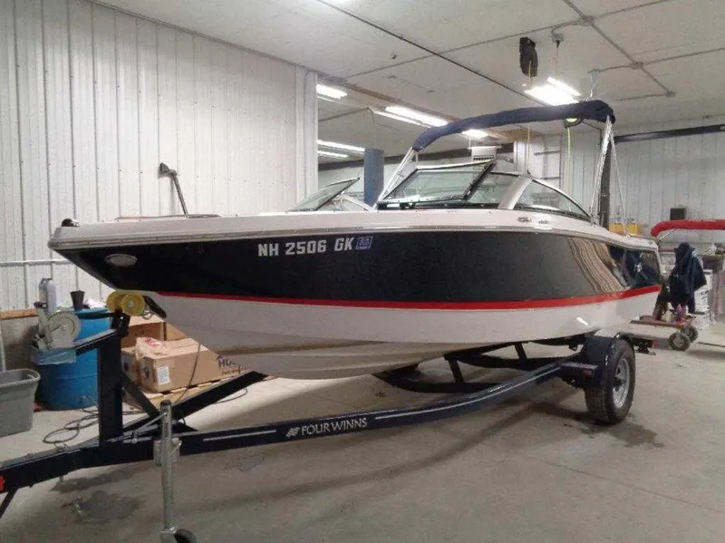 Features a swim platform mat, cockpit reed mat flooring, cockpit and forward covers, bimini top, bow scuff plate, flip up bolster seats, pull up cleats and the convenience package. On a Four Winns single axle, painted trailer. Boat is navy blue with a red accent stripe. Brokerage boat-trade in's not accepted.