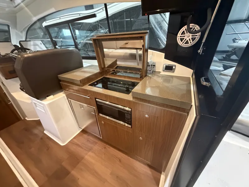 - Fully Appointed Galley: Includes a refrigerator/freezer, microwave, electric cooktop, and deep stainless sink with solid-surface counters.