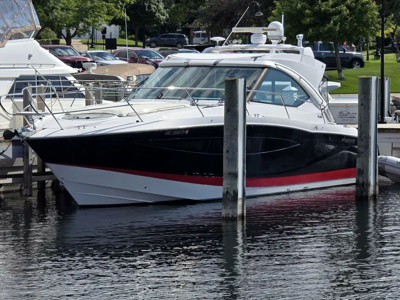 The 2009 Four Winns V435 is a luxury sport cruiser designed for both performance and comfort. The V435 cuts no corners and spares no expense, it simply offers a fantastic design with unmatched fit and finish as well as an abundance of creature comforts! The V435 features a fully equipped galley, large salon with panoramic windows, two heads and two private staterooms, making it perfect for entertaining or extended trips. With its sleek profile, spacious layout, and powerful twin diesel engines, it offers exceptional handling and a smooth ride. Additional highlights include a retractable hardtop, state-of-the-art navigation systems, and a generous swim platform, delivering a blend of elegance and functionality on the water. Ideal for boating enthusiasts seeking a premium cruising experience. This is a fresh water boat only, spending it's life on the Great Lakes. Upgraded Lumitec Underwater lights. Hydraulic swim platform with brackets for dinghy. Diesel generator. Retractable 50amp power cord. Teak on swim platform was professional redone with grit (for swimming) and in cockpit (oiled). Full suite of Raymarine E120, open array radar, and auto pilot. This boat is ready to cruise and is priced to move, so be sure to book your private showing today! FRESH WATER ONLY - VOLVO DIESEL IPS500 - HUGE SUNROOF - TEAK DECK - HARDWOOD FLOORS.