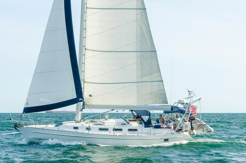 "Freedom" is fully equipped with two staterooms and two heads, autopilot, RADAR, GPS, TV and DVD player, Inverter, feathering Max prop, electric Maxwell anchor windlass, custom coil spring aft mattress, Ultrasuede fabrics and a varnished cherry wood interior. Thoughtfully upgraded with new mainsail ('22), newer internal furling boom mechanism/claw ('18), rebuilt electric halyard winch with new drum & gears ('18), custom dodger & bimini ('19), cockpit cushions ('21), SimRad GPS/Chart Plotter ('18), AIS Transmitter ('19), galley refrigerator ('20), wind generator ('20), and all new batteries ('20, '21). Recent survey available.