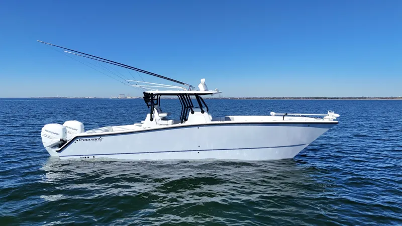 Introducing the cleanest 2022 Freeman 34VH on the market. The twin Mercury 400 Verados have only begun to be broken in with only 330 hours. The upholstery is without a blemish, and the entire boat is white glove clean. The hull-matched Whisper Grey underside of the T-Top paired with the black powdercoated T-Top frame is sure to turn heads. Not only is this Freeman like-new cosmetically, she is ready to fish with Gemlux Outriggers, Garmin Open Array Radar and Autopilot, Airmar B175 H/L Transducer, never used Eisenglass, rod holders everywhere, and much much more. She also comes with a FloatOn Trailer that is fully serviced and ready to go!