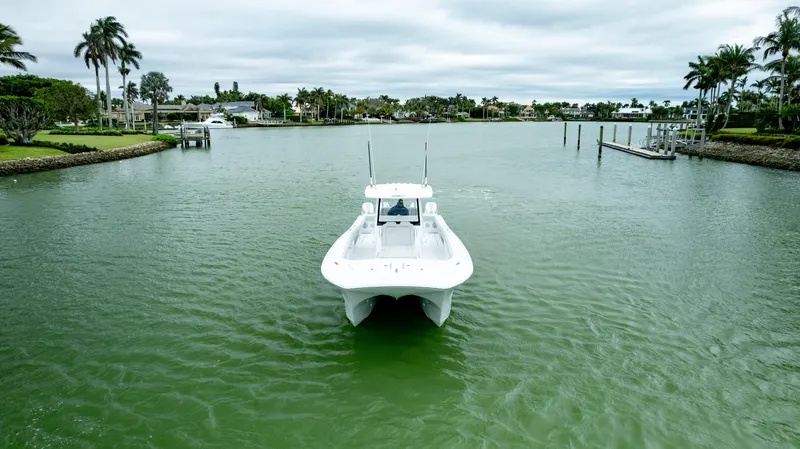 At 37'9", and a 12' beam, she is bigger than most other boats in her class. Sporting a large deck area, flared bow, and high-performance step bottom, she will run further and faster than others in her class. She is as accommodating as many boats that are much larger. Options and features include: