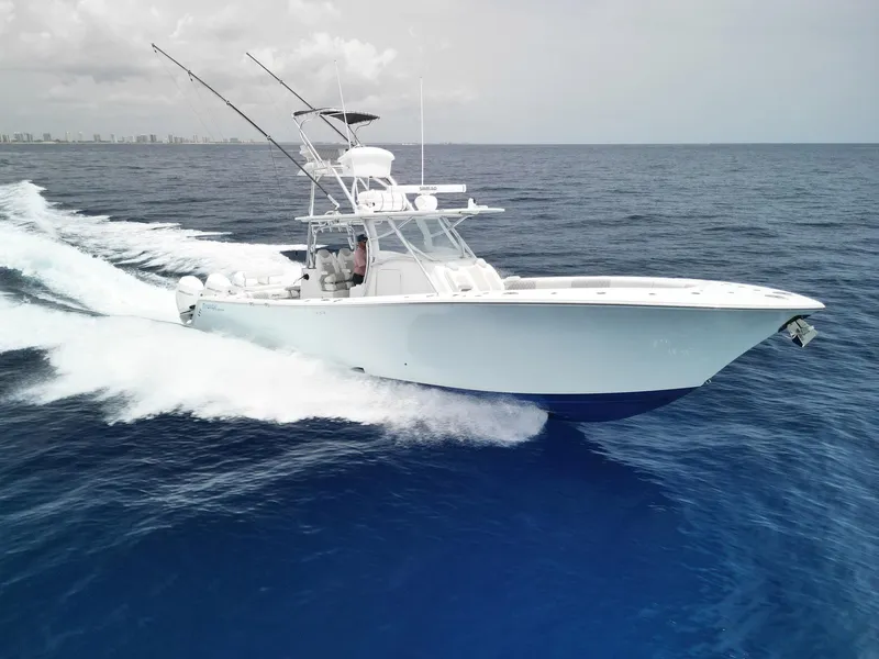 Some notable options include triple Simrad multifunction displays, folding marlin tower, SiOnyx Nightwave camera, bow thruster, dive door, underwater lights, upgraded JL audio system, triple helm seats, Gemlux carbon fiber outriggers with center rigger, SeaDek, cockpit screen, slide out Frigid Rigid cooler, insulated sun lounge with chiller plate, air-conditioned cabin with a TV, tackle center, and much more.