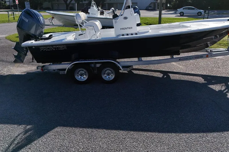 2104 Frontier with a Yamaha F150XC Entire Hull Flag Blue. Interior is White Voyage/Bronze Wave. Elite Leaning Post with a 70QT K2 Cooler. Side Box Snap Cushions. Fresh Water Wash Down, Lenco Trim Tabs, Swim Platform. Comes with Trailer.