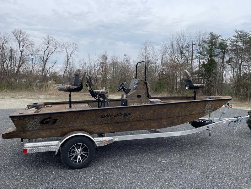 2024 G3 Bay 20 GX. Shadow Grass Camo. Yamaha VF115 or VF150. Pre-wire for Trolling Motor. Nav Lights. Interior Light. Livewell. Bilge Pump. Built in Fuel Tank. Buoyancy Pods. Aluminum Trailer w/Spare.