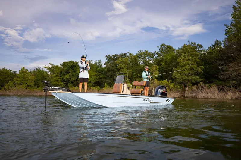 The 2026 G3 Bay 21 GX Tunnel Hull is a 21' 2" center console aluminum bay boat designed for both shallow and open water use, featuring a tunnel hull for enhanced maneuverability and draft. It is equipped with a Yamaha 175 HP V-Max outboard engine, can carry up to 8 passengers, and includes features like a livewell system, ample storage, and buoyancy pods for stability. The boat is built with an all-aluminum welded hull and a hydraulic jack plate.