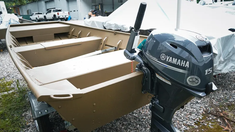 The 2025 G3 1448LW is a lightweight, all-welded aluminum Jon boat designed for simplicity, portability, and reliability. With a flat-bottom layout, this 14-foot model is ideal for anglers and hunters who need shallow-water access and easy trailering. Its compact size and Desert Brown exterior/interior allow for stealthy navigation in backwaters, creeks, and marshes. Paired with a Yamaha 15 HP outboard, the 1448LW offers dependable performance for solo outings or small crews. Whether you are duck hunting at dawn or dropping lines in hidden honey holes, this Jon boat delivers practical performance at an unbeatable value.