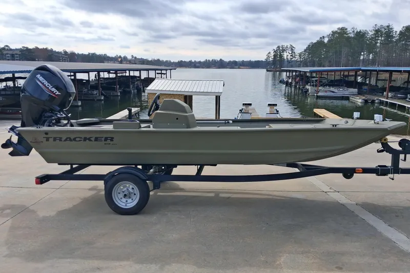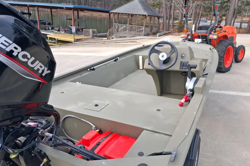 Features include a bimini top, camo captain chairs with lean back post, fishing rod holders, stainless steel prop, windshield, versa manual jack, and more.