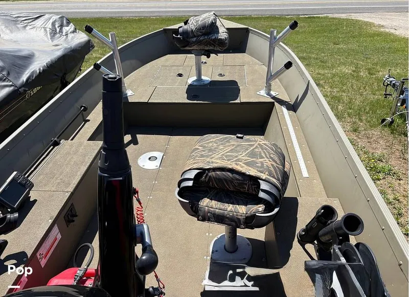 The interior features marine-grade vinyl flooring for easy cleanup and two high-back fishing seats for all-day comfort.