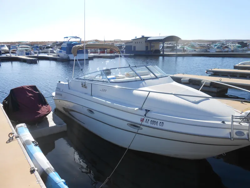 This 2003 Glastron GS 249 is a 24-foot, 9-inch cruiser boat. It offers comfortable seating for up to 10 people with a spacious cabin featuring a galley, dinette, and sleeping accommodations for four people.