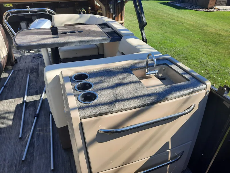 2022 Godfrey Aqua Patio Tritoon 23ft Aluminum with Trailer. Has Vinyl flooring option with 150hp 4-stroke Outboard and only 90 hours of use. Maticulous maintained, it has options including Garmin GPS console, porta potty, wet bar. deluxe tri-color seating, full mooring cover, bimini, Dual switch batteries, Fusion stereo system, rear dinette table, and full hydraulic steering package.
