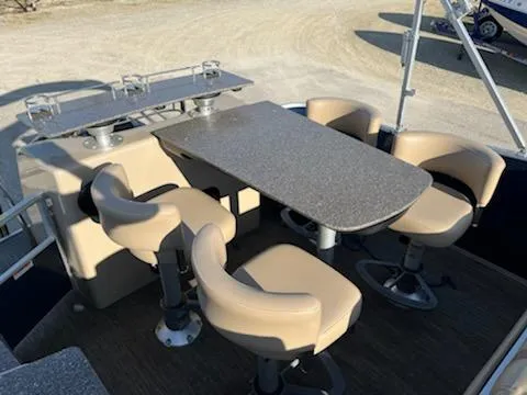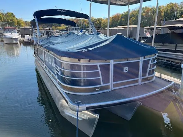 The ultimate pontoon boat is the Aqua Patio 259 Center Bar Deluxe. Features include the 4 person solid surface table that is large enough for a meal or to play games, double bimini tops and seating for all of your friends and family. Options include 27" triple tube performance package with lifting strakes, hydraulic steering and wave shield and in floor ski locker. Simrad GPS and depth finder, dual batteries with switch, Fusion stereo system and more. Powered with a Mercury 150 HP four stroke engine with only 60 hours!. You'll be the envy of everyone with this beauty.