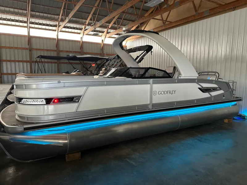 TWO WEEK SALE FOR LISTED PRICE GOOD TILL 5-11-25 SAVE RIGHT NOW!!!The 2025 Godfrey AquaPatio 255SFLW is an absolute standout in the world of luxury pontoons, blending sophisticated design, cutting-edge features, and superior comfort to create an unmatched boating experience. One of its most impressive features is the powered arch. This arch not only adds a sleek, modern touch to the boat's aesthetic but also offers a practical function. With the push of a button, you can raise and lower the arch, making it incredibly easy to navigate low-clearance areas, such as bridges, or to customize the boat's profile to suit your preferences. It's the perfect combination of style and convenience. Another standout feature is the windshield. The 255SFLW boasts a large, stylish, and functional windshield that provides excellent wind protection while still maintaining an open, airy feel. It ensures that passengers can comfortably enjoy the boat even at higher speeds or during those breezy, open-water moments. It's an upgrade that enhances the overall boating experience, offering both aesthetic appeal and practical protection from the elements. The design of the 255SFLW is built for both relaxation and performance. Whether you're lounging on the plush seating, cruising across the water, or hosting a gathering, this pontoon offers the space and amenities to make every moment special. It's truly a premium boat that delivers the perfect balance of luxury and functionality. The 2025 Godfrey AquaPatio 255SFLW truly shines with its IMPACT+ Toon Package, which takes the boating experience to an entirely new level. This premium package includes several enhancements that elevate the performance, durability, and overall enjoyment of the boat. The IMPACT+ Toon Package features reinforced, high-performance pontoons that provide superior stability and lift. These specially designed pontoons help the boat glide smoothly through the water, whether you're cruising at high speeds or taking a leisurely ride. Not only does this enhance the boat's overall ride quality.