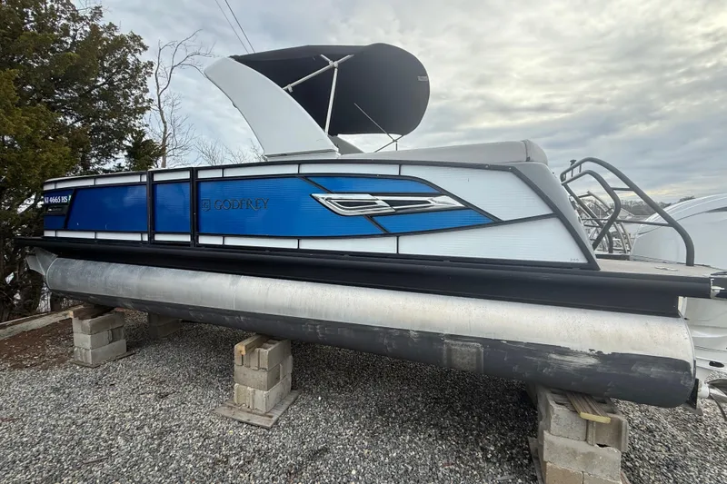 Introducing the stunning 2023 Godfrey AquaPatio 255 ULC, a remarkable pontoon boat that combines style and performance. With an overall length of 25.5 feet, this vessel is crafted from durable aluminum, ensuring both strength and stability on the water. Powered by a robust Yamaha F300 outboard engine, delivering an impressive 300 horsepower, it promises exhilarating rides and smooth cruising experiences. The AquaPatio 255 ULC is designed for comfort and enjoyment, featuring ample space for relaxation and socializing. Its sleek pontoon shape enhances maneuverability while providing a stable platform for all your aquatic adventures. The stainless steel 3-blade propeller adds to its efficiency and performance, making it a reliable choice for both leisurely outings and spirited excursions. This used pontoon boat is a fantastic opportunity to own a modern, well-equipped vessel that is ready to create unforgettable memories on the water.