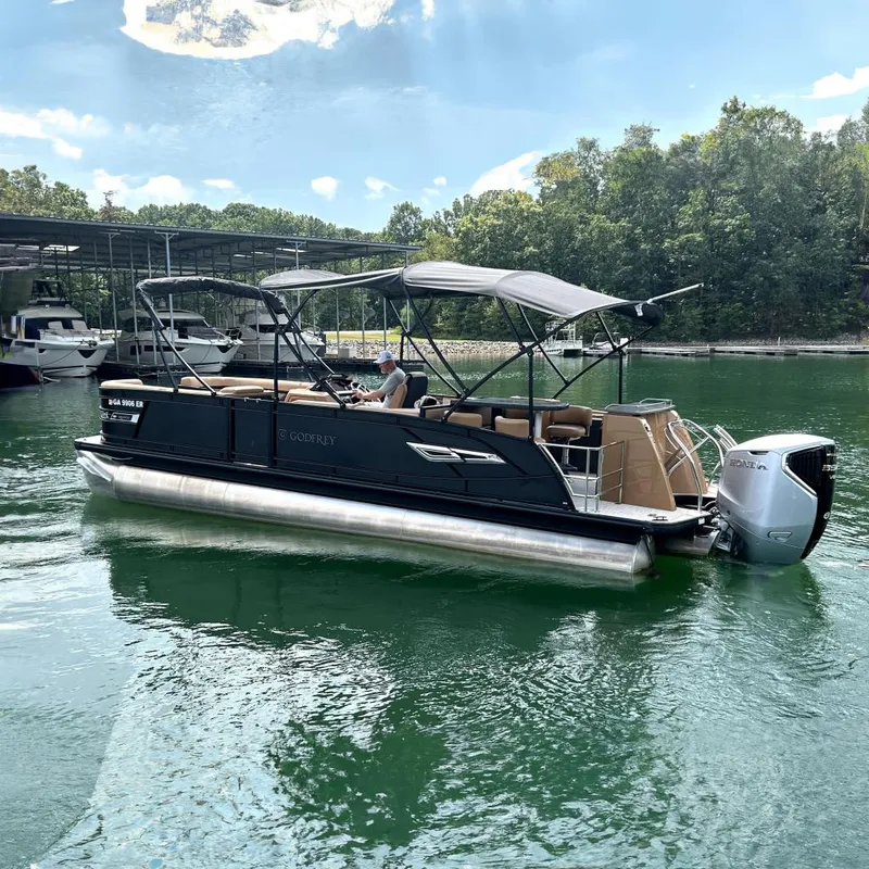 The 2025 Godfrey AquaPatio 255 CBE is a pontoon boat built for entertainment, featuring a unique "Center Bar Entertainer" layout with a bar, sink, and stools for socializing. It measures 25' 9" overall with a 8' 6" beam, offers seating for up to 17 people (with the iMPACT+ package), and is powered with a 350hp Suzuki outboard. Key features include a spacious lounge, integrated entertainment center, storage for coolers, and options like a power bimini, Fusion subwoofer, and Garmin GPS.Key features