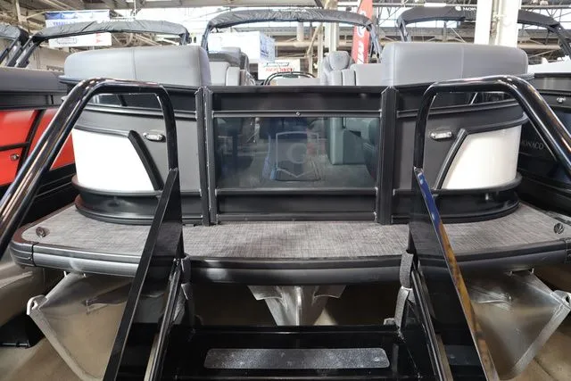 2026 Godfrey Monaco 235 SFLC Triple Tube Package, Price includes a Mercury 200XL, Stainless Steel Prop, Tandem Axle trailer with Brakes and 27" iMPACT Center Tube 2.0 Package with Centered Fuel Tank; Two 25" outer tubes with 27" center tube: Under deck skin (full length): Inside Skirting: Lifting strakes: 48 gallon fuel tank: Multifunction GPS Gauges, Midnight Package w/ Black Ultimate Ski Tow Cage (Black Skirting w/ Bow Extension, Black Rub Rail w/ Black Vinyl Insert, Black Rails, Black Canopy Frame, Black Corner Caps, Black Ultimate Ski Tow, Black Pull-Up Cleats), Extended Deck (Rear platforms integrated into deck structure with SS Safety Barrier & Gate), LED docking lights, Lilipad Ladder, SeaView Bow Gate, Sea Star Power Assist Steering with Tilt Wheel, In Floor Storage w/ Mat. Standard Power Bimini top with protective boot and dome light (Black) Teak Isle; Folding Table, Wireless Phone Charger - Charging Pad; 10W fast charging, Elevated Helm Station with Matt, Console Trashcan, Glovebox - Lockable, Simrad NSX3007 Touchscreen, Captain's & Co-Captain's Chair Recliner Chair w/ Quilting: Swivel, slider, reclining, fold down arms with 15" pedestal, USB-C charging ports: Additional USB-C Chargers throughout layout, Stainless Steel Cupholders, Toy Box Storage, Sport Black Ski Tow Bar, Stereo; Clarion Silver - CMM-30 head unit with full color LCD display, Bluetooth, AUX input, 4x25W RMS output, (4) Speakers with Sport Black Grilles