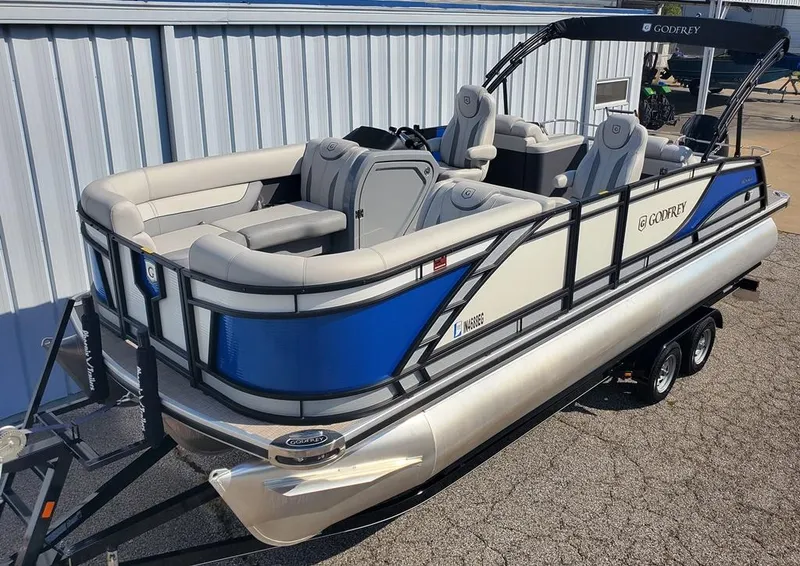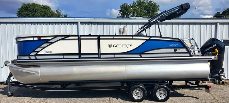2021 Godfrey Monaco 235 RL Triple Tube (23'11" X 8'6"), 2021 Mercury 200 HP V6 EFI, 2021 Phoenix tandem wide Axle bunk trailer with load guides, disc brakes, center tube support bunks & ladder winch stand. This boat has Black rails With Vapor Blue rail skins, smooth White insert & Metallic Silver accents. The interior has soft touch Lunar Gray Base vinyl with cool touch Slate Gray accents, wicker wrapped seat bases and Platinum weave full length vinyl Flooring. The floorplan has high back adjustable bucket seats for the driver & passenger, (2) bow loungers with Forward facing chaise backrests & (2) deluxe aft facing rear loungers. Helm features include SeaStar hydraulic Steering with tilt wheel, Lowrance Hook 4X in dash fishfinder, GPS speedometer, tach, trim, fuel and hour meters, Fusion Marine AM/FM/Bluetooth Stereo with AUX & USB Inputs & (4) RGB speakers, raised FBG helm with Gray marine mat flooring, 12V rec. & LED docking lights. Other features include the 27" GTP center tube pkg. With lifting strakes, heavy duty channels, Aluminum underskinning and 45 gallon fuel tank upgrade, under floor Ski storage, dual battery system with switch, extended deck pkg. with EZ climb SST swim ladder, SST ski tow bar, SST aft safety fence, SST "Pull Up" cleats, SST corner castings, heavy duty Rub rail with Black rubber insert, SST "Enertia" prop, Trac Pontoon 35 electric anchor winch (Stern), Black Bimini Top frame, canvas & full factory snap down playpen cover for storage. This is a one owner boat, sold and serviced here Since new in excellent condition with only 45 engine hours use.
