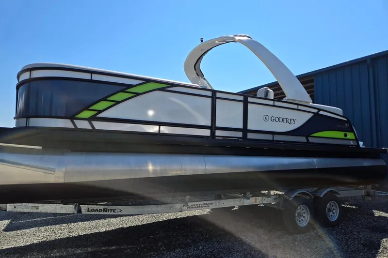 Pacific Smooth Rails with Metallic Pearl White Insert, Pearl White Top Stripe, Silver Bottom Stripe, Bright Kiwi Accent Graphics, Bayside Slate Base Vinyl with Plus Quilting Upgrade, and Harbor Gray Sea Grass Decking