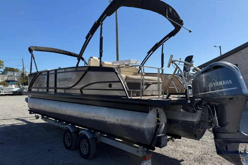 This 2022 Godfrey Monaco 255 SFL Tritoon is a premium, family-friendly tritoon designed for cruising, entertaining, and full-day outings on the water. Powered by a Yamaha F300XA with only 110 hours and covered under factory warranty through 05/17/2028, this boat is exceptionally well equipped and ready to enjoy. With versatile seating, high-end features, and a trailer included, this is a complete, turnkey package.
