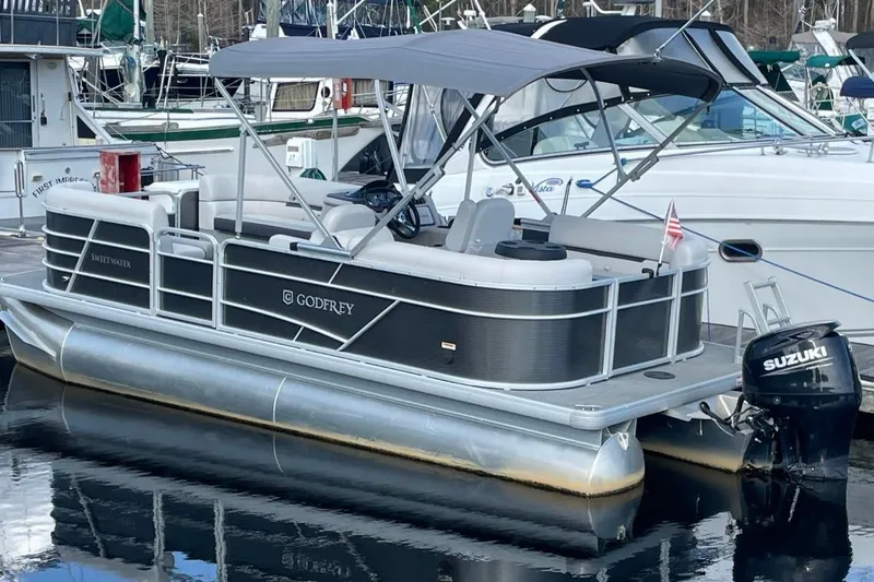 Introducing the 2023 Godfrey Sweetwater 2086 SB, a remarkable pontoon boat that combines style and functionality. Measuring an impressive 20.92 feet in overall length, this used vessel is crafted from durable aluminum, ensuring both lightweight maneuverability and robust performance on the water. Powered by a reliable 2023 Suzuki DF90 outboard engine, this boat offers an exhilarating experience with its efficient gasoline fuel system. With only 155 hours of use, it promises plenty of adventures ahead. Designed for comfort and leisure, the Sweetwater 2086 SB is perfect for gatherings with friends and family, providing ample space for relaxation and enjoyment. Its sleek pontoon shape enhances stability and smooth sailing, making it an ideal choice for both serene cruising and lively outings. Embrace the joy of boating with this exceptional pontoon that blends modern engineering with timeless appeal.