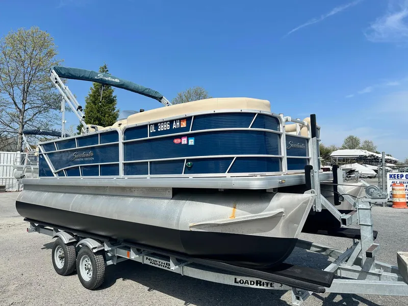 She is Nicely Equipped with a Bimini Top, Boot Cover, Coastal Edition Model, 27" Pontoons, Vinyl Deck, Seat Covers, Tilt Steering, Elite GPS, Depth Finder, Changing Room with Porta Potty, CD Stereo, Deck Speakers, Rod Storage, Dock Lights, Coast Guard Package, Rod Holders, Cup Holders, Boarding/Swim Ladder, Fresh Bottom Paint in April of 2025 and So Much More.