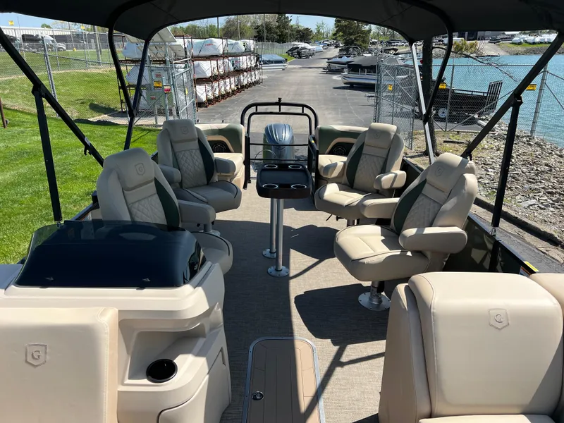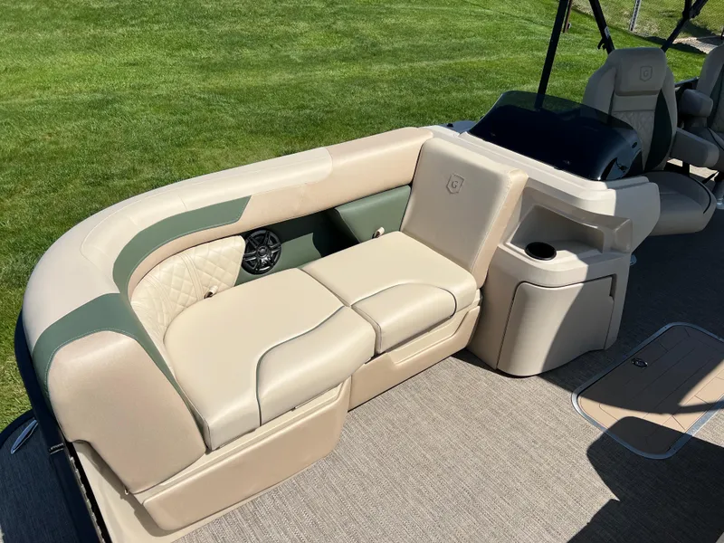 The "Quad Social" layout includes multiple lounge areas and a rear deck extension, providing ample space for social gatherings. Features in-floor storage and a tilt-out trash can for easy cleanup. Equipped with a Lowrance Eagle 5 fish finder/chartplotter and multi-function GPS gauges for navigation and fishing. Includes a wireless phone charger and USB-C ports for convenient device charging. Comes with a power bimini top with a dome light, LED docking lights, and a Clarion Plus Bluetooth stereo system with four speakers for enhanced comfort and entertainment. This model combines practical features with modern amenities, making it an excellent choice for families and groups seeking a comfortable and enjoyable boating experience.