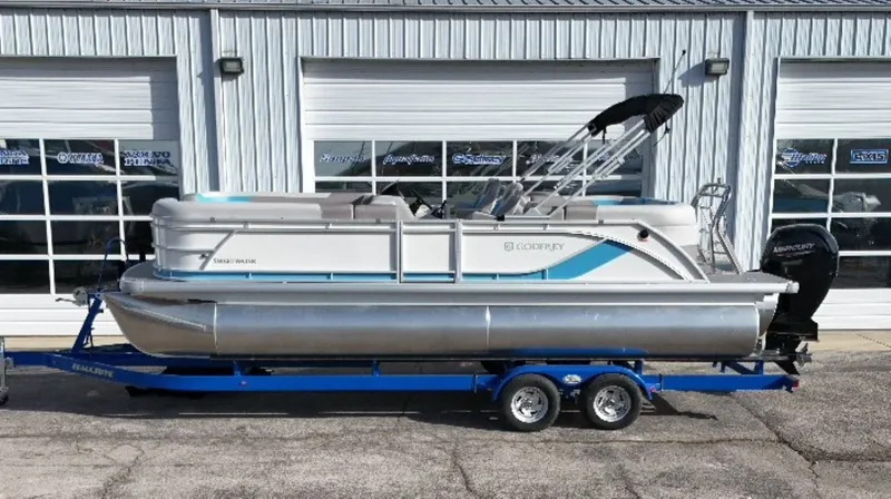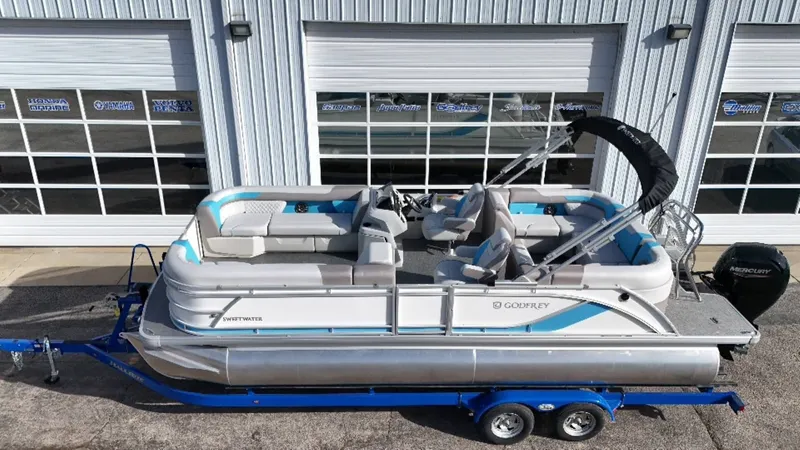 2025 Godfrey Sweetwater 2286 SB w/ iMPACT PLUS Toon Package, 2025 Godfrey Sweetwater 2286 Split Bench Tritoon: Discover the comfort and precision of a top-tier nautical experience with this luxury boat. Powered by a robust Mercury 150 Four Stroke Outboard engine, the Godfrey Sweetwater provides exceptional performance and reliability, ensuring you a smooth ride every time. Alongside the standard features offered, this boat is equipped with an array of extra options to amplify your water adventure. Whether you're cruising the shoreline with family or fishing with friends, the Godfrey Sweetwater Tritoon is designed to cater to your needs, offering maximum passenger comfort and superior control. iMPACT Plus Tritoon Package: Taking standardized boating to a whole new level is the iMPACT Plus tritoon package. This sought-after feature enhances the boat's maneuverability and performance, proving that the Godfrey Sweetwater Tritoon truly is the perfect fusion of style, comfort, and technological brilliance. With the 2025 Godfrey Sweetwater 2286 Split Bench Tritoon, you have the power to transform a regular outing into a remarkable voyage - every time.