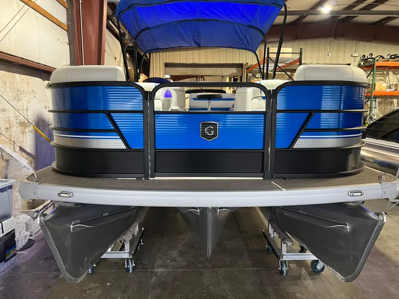 BLACK FRAME, VAPOR BLUE TOP, PEAR WHITE GRAPHICS, LED DOCKING LIGHTS, VAPOR BLUE RAIL SKIN, HATCH SLATE FLOORING, BAYSIDE WHITE SOFT TOUCH, HYDRAULIC STEERING, FULL SPECTRUM RGB PACKAGE, GTP 27" TRITOON