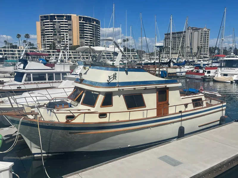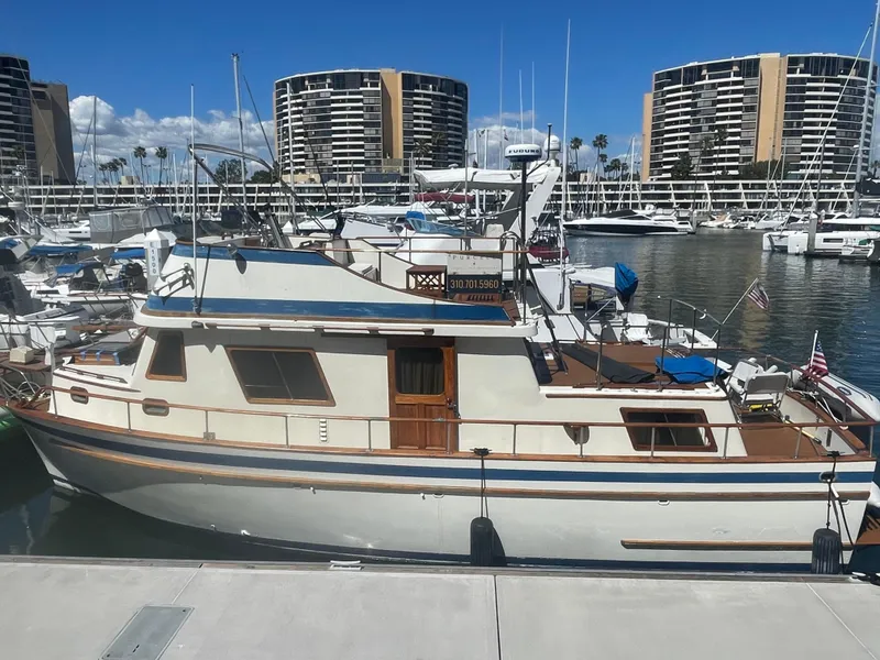 Introducing the 1979 Golden Star Aft Cabin, a remarkable trawler that combines classic design with modern performance. With an overall length of 44 feet, this vessel offers ample space for relaxation and adventure on the water. Crafted from durable fiberglass, the hull ensures a smooth and stable ride. Powered by twin Ford Lehman 120 hp diesel engines, this trawler boasts impressive reliability and efficiency, with engine hours of 716 and 665, respectively. The direct drive configuration and bronze 5-blade propellers enhance maneuverability, making it perfect for both cruising and docking. Accommodations include two well-appointed cabins and two heads, providing comfort for extended voyages. With a cruising speed of 10 knots and a maximum hull speed of 12 knots, the Golden Star Aft Cabin is designed for enjoyable and leisurely journeys. Experience the charm and functionality of this classic trawler, ideal for both seasoned sailors and newcomers alike.