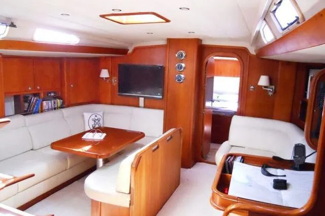 Step into Luxury when you walk down the wide companionway entrance to find the grand salon with dinette, wall mounted freezer and ice machine, entertainment center, and cabinets to port, a settee to starboard with glass doors and mirrors above that houses the spirits. Navigation center is just aft of the settee and contains the electrical panel, communications, instruments, and has a large opening desk with drawer storage. Salon seat cushions are beige leather. Walking forward is the guest stateroom with abundant storage in cabinets and drawers, centerline queen bed, settee, and has its own private head and shower. Large hatch overhead provides light and has a shade cover for privacy. Moving aft to port adjacent to companionway is a smaller private stateroom with double bed, storage, and ensuite head and shower. On the opposite side of the companionway is the gourmet galley with expansive countertops, pantry, stainless steel sink, microwave, single door refrigerator, two burner electric cooktop, and many drawers, spice rack, cabinets, and under floor storage. Engine room access is aft in the galley. Next aft through the galley is the palatial master stateroom. Centerline large master berth with seating on either side. Single berth on portside, and desk mounted on forward bulkhead with mirror above, Large master head with VacuFlush system, vanity and sink, and shower. Features of vessel: Exquisite woodwork and joinery throughout, Corian counters, air conditioning with zone controls in each stateroom, recessed lighting in ceiling, leather upholstery and fitted carpeting throughout. She sleeps 8 in three private staterooms with ensuite head/showers and crew quarters in bow accessed from deck.