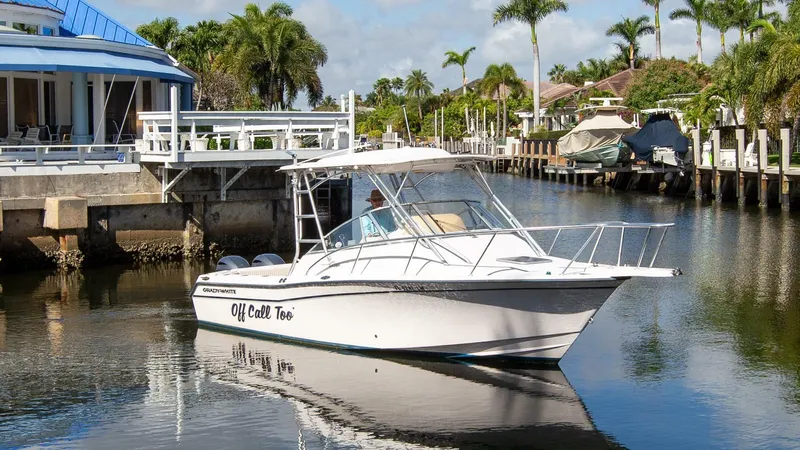 The Grady-White Express Cruiser 265 is a 26 foot express cabin known for its offshore capability and comfort. Below deck, you'll find a forward V-Berth, compact galley, and enclosed head with sink and shower, ideal for overnight trips. The spacious 58 sq. ft. cockpit offers a center helm, wraparound seating, hardtop with electronics boxes, and ample storage throughout. Anglers will appreciate the 40-gal livewell, 300-quart insulated fish box, and rigging station with sink and storage.