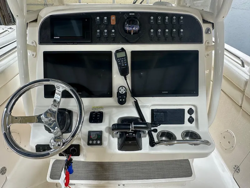 A Popular Grady White 271 Canyon in very good condition with a very nice seaport blue hull color. This boat is powered by twin Yamaha F300XCA's with 497 hours and warranty coverage through October 2025. Equipped with a high quality electronics package that includes Dual Garmin 16" touch screens, Transducer, Standrad Horizon VHF radio, Fusion AM/FM Bluetooth stereo with speakers throughout the boat, a Garmin Fantom 18 radar and a remote control spotlight. Other features of this boat include a bow thruster, powered windlass with controls at the bow, a bow table, dual livewells and multiple fishboxes, a marine head with holding tank and pump-out, and T-top wings to help protect from the wind. This boat is in very good shape and wont last long. Call today before its gone!