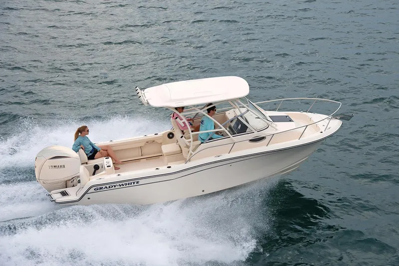 Grady-White's Adventure 218, a go-anywhere, do-it-all, reimagined version of the original walkaround cabin design. The 218 is sleek and stylish, built on Grady's heritage of superior performance, exceptional quality, seaworthy-safety, and versatility. Designed for both the devoted angler and families that fish, play, and overnight, the 218's wider beam provides a more spacious walkaround and cabin. The addition of integrated swim platforms and pivoting aft seat backs affords more room for the angler to fight fish while also providing easy access for watersports. The curved windshield and signature sheerline yield an updated profile that adds to this boat's head-turning appeal.