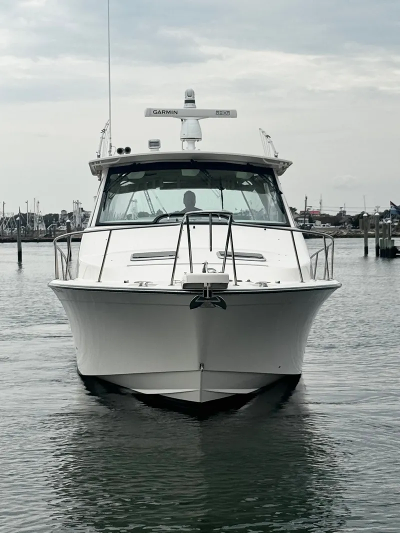 This is a well-maintained boat with low hours. She is built to fish or cruise and has nice accommodations to travel with. The raised Helm Deck gives you a clear view all around the boat. The boat has two double berths, convertible dinette, enclosed Head / Shower, full-service Galley, and plenty of rod storage. The Helm and Cockpit area have a nice hardtop and the windshield goes up to the hardtop. It also has Helm air conditioning to make if comfortable on those hot days and Joystick control making docking easier for some. In the Cockpit there is a 48-gallon live well, rigging station with sink, fold away bench seats, bow thruster, generator, freshwater and saltwater washdowns and a windlass that all make this boat an all-around comfortable boat that will do what you want. The triple 425 hp. Yamahas will get you there quickly.