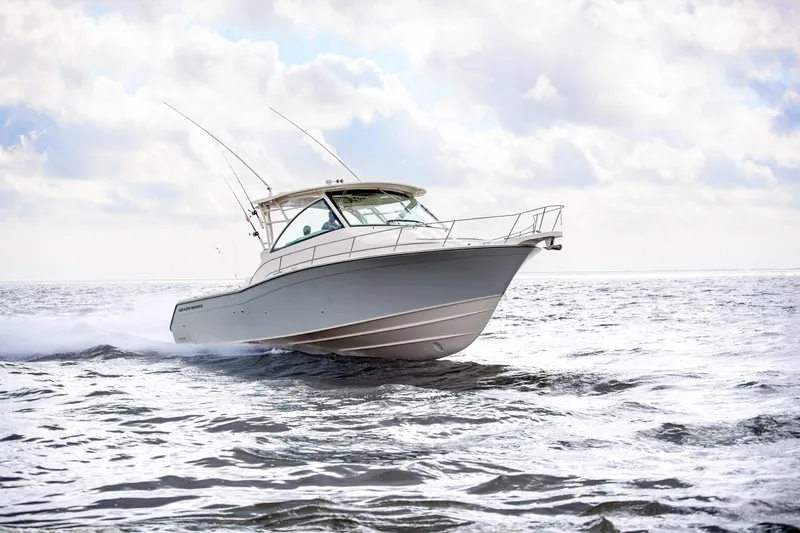 Spacious Layout: The Express 370 features a roomy cockpit and comfortable cabin accommodations, making it ideal for both fishing trips and family outings. 2. Performance: Powered by twin outboard engines, it delivers excellent speed and handling, ensuring a smooth and stable ride even in choppy waters. 3. Quality Construction: Known for its solid build and high-quality materials, the boat offers durability and reliability for long-term use. 4. Fishing Amenities: Equipped with features like rod holders, live wells, and ample storage for gear, it caters well to serious anglers. 5. Comfort and Convenience: The cabin includes sleeping quarters, a galley, and a head, providing comfort for overnight trips. 6. Advanced Electronics: Comes with modern navigation and fish-finding electronics to enhance safety and fishing success.