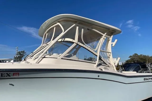Pre-Owned 2022 Grady White 235 Freedom, Yamaha F300XCB with 247 Hours, Celestial Blue Hull Color, Powder Coated Fiberglass Hard Top with Curtains, Fresh Water, Raw Water, Electric Chaise Lounge, Rear Bench Seat, Porcelain Head, Windlass Anchor, Dual Batteries w/switch, Captains Chair w/Bolster and Arm Rests, Garmin 12" MFD w/Thru Hull Transducer, Icom VHF Radio. Fusion Stereo w/Bluetooth, Ski Tow Bar, Bennett Trim Tabs, Really Nice Boat! *No Trailer Included* Engine Has 247 Hours
